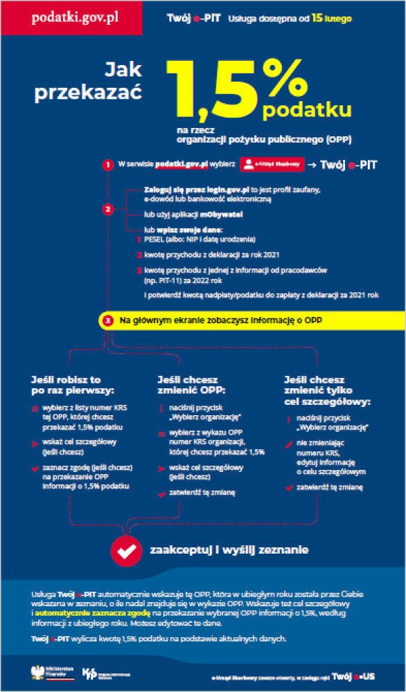 Ponadto, jeżeli otrzymałeś od organu rentowego roczne obliczenie podatku PIT-40A i nie złożysz wniosku PIT-OP, organ podatkowy przekaże kwotę 1,5% podatku należnego na rzecz OPP wskazanej przez Ciebie we wniosku zawartym w zeznaniu, korekcie zeznania lub w PIT-OP za 2022 rok. W tym przypadku przekazanie kwoty 1,5% podatku należnego na rzecz OPP następuje na podstawie wniosku PIT-OP sporządzonego przez organ podatkowy za pośrednictwem portalu podatkowego (automatyczna akceptacja PIT-OP).