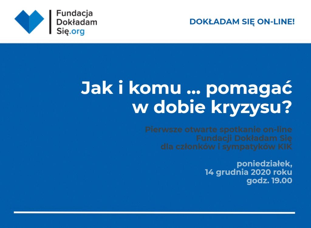 Fundacja Dokładam Się (powołana przez KIK w 2017 roku) zaprasza na spotkanie on-line w poniedziałek, 14 grudnia 2020 o godz. 19.00.