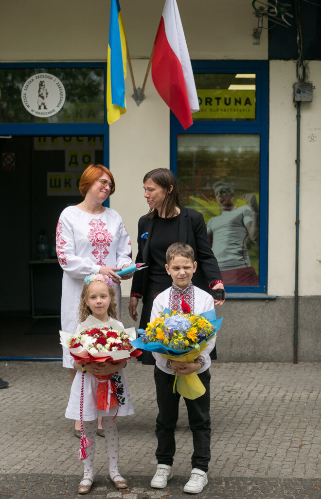 Przed budynkiem Szkoły uczniowie przywitali Pierwszą Damę RP i Małżonkę Ambasadora Ukrainy kwiatami w barwach Polski i Ukrainy.