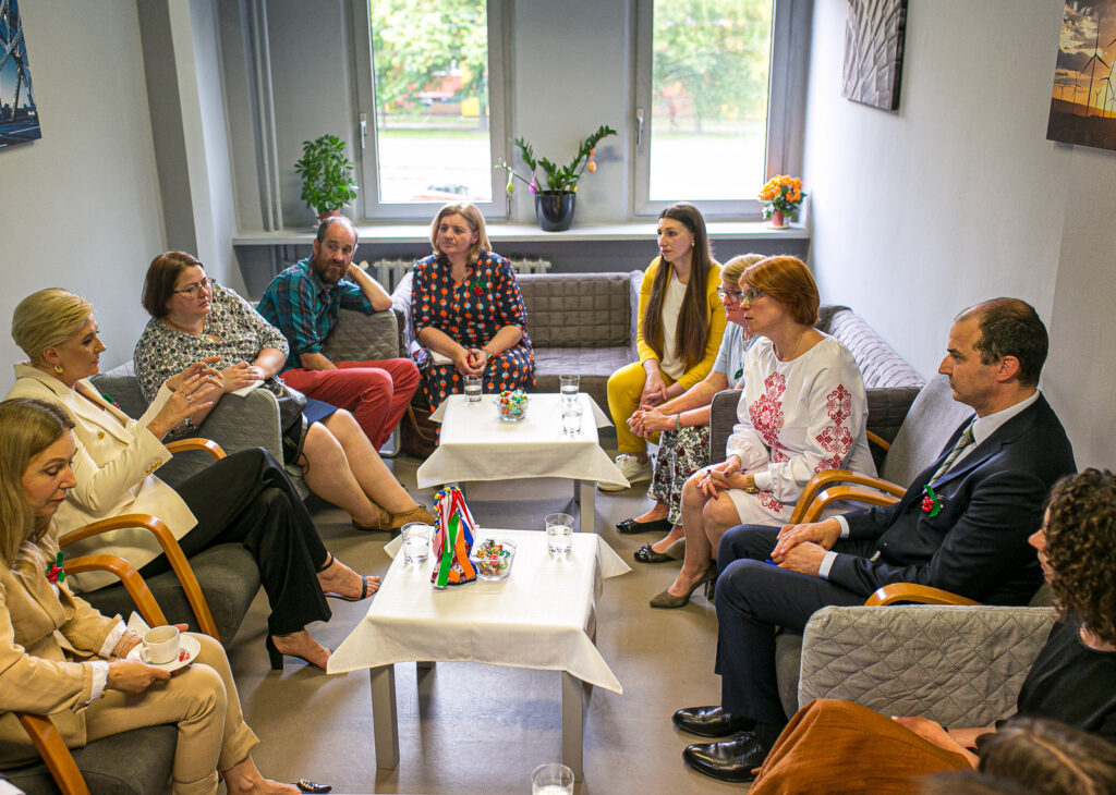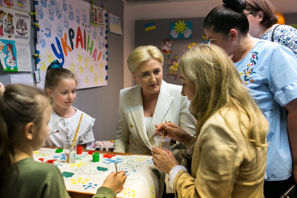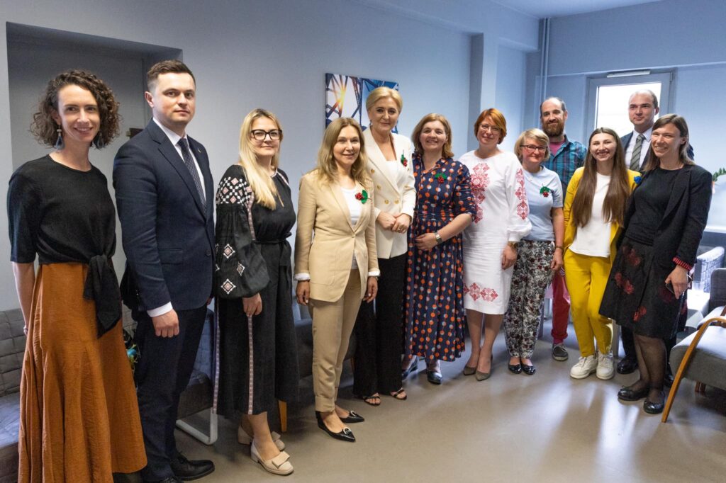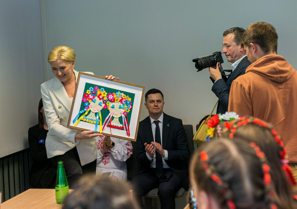 Ważnym punktem tej wizyty było spotkanie Agaty Kornhauser-Dudy i Iriny Deszczycy z dyrekcją Szkoły oraz przedstawicielami organizacji, dzięki którym placówka mogła rozpocząć działalność i przyjąć uczniów z Ukrainy. W spotkaniu, którego tematem były potrzeby edukacyjne ukraińskich uczniów w Polsce, wsparcie psychologiczne dzieci i nauczycieli oraz przyszłość SzkoUA, uczestniczyli Agata Kornhauser-Duda, Irina Deszczycia, Jakub Kiersnowski z Klubu Inteligencji Katolickiej w Warszawie, Debrah Barry, Kristiana Marton i Leila Davies z Save the Children, Miroslava Keryk i Benjamin Cope z Fundacji Nasz Wybór prowadzącej Ukraiński Dom, Yevhenia Yemshenetska i Vitalyi Bilyi z Ambasady Ukrainy w Polsce, Oksana Kolesnyk, Oksana Vakhil i Antonina Michałowska z dyrekcji SzkoUA.