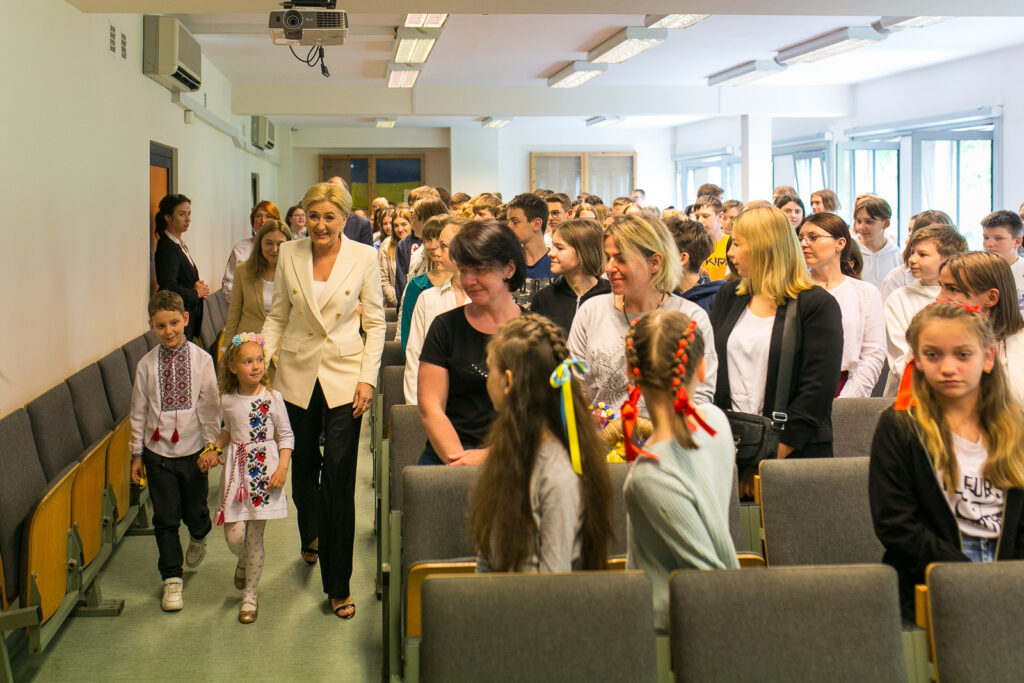 Agata Kornhauser-Duda i Irina Deszczycia zwiedziły budynek szkolny i rozmawiały z uczniami, nauczycielami oraz pracownikami, a następnie wszyscy zebrali się w auli, gdzie uroczyście i z dużym wzruszeniem odśpiewano hymny Polski i Ukrainy.