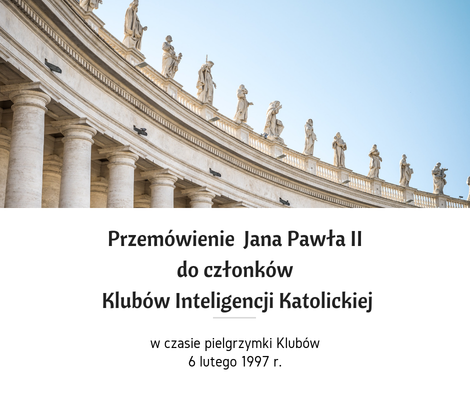 Z okazji 40. rocznicy wyboru kardynała Karola Wojtyły na Stolicę Piotrową chcielibyśmy przypomnieć przemówienie Jana Pawła II do członków Klubów Inteligencji Katolickiej, wygłoszone 6 lutego 1997 roku.