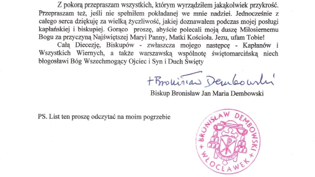 Rok temu zmarł śp. ksiądz biskup Bronisław Dembowski, biskup senior diecezji włocławskiej, Członek Honorowy Klubu Inteligencji Katolickiej w Warszawie, były rektor kościoła św. Marcina przy ul. Piwnej w Warszawie, pierwszy i wieloletni rektor kościoła św. Marcina przy ul. Piwnej w Warszawie.
