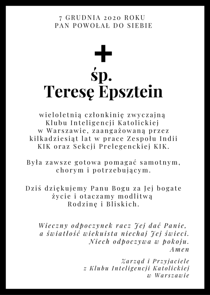 Z głębokim żalem informujemy o śmierci Teresy Epsztein, członkini Klubu Inteligencji Katolickiej w Warszawie.