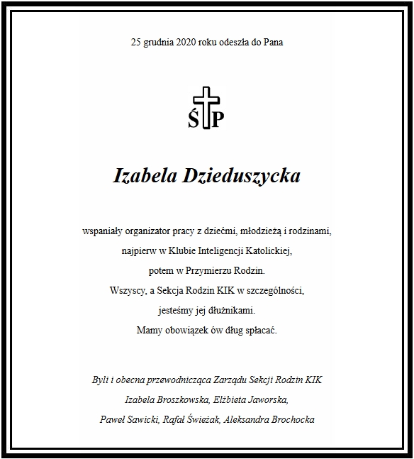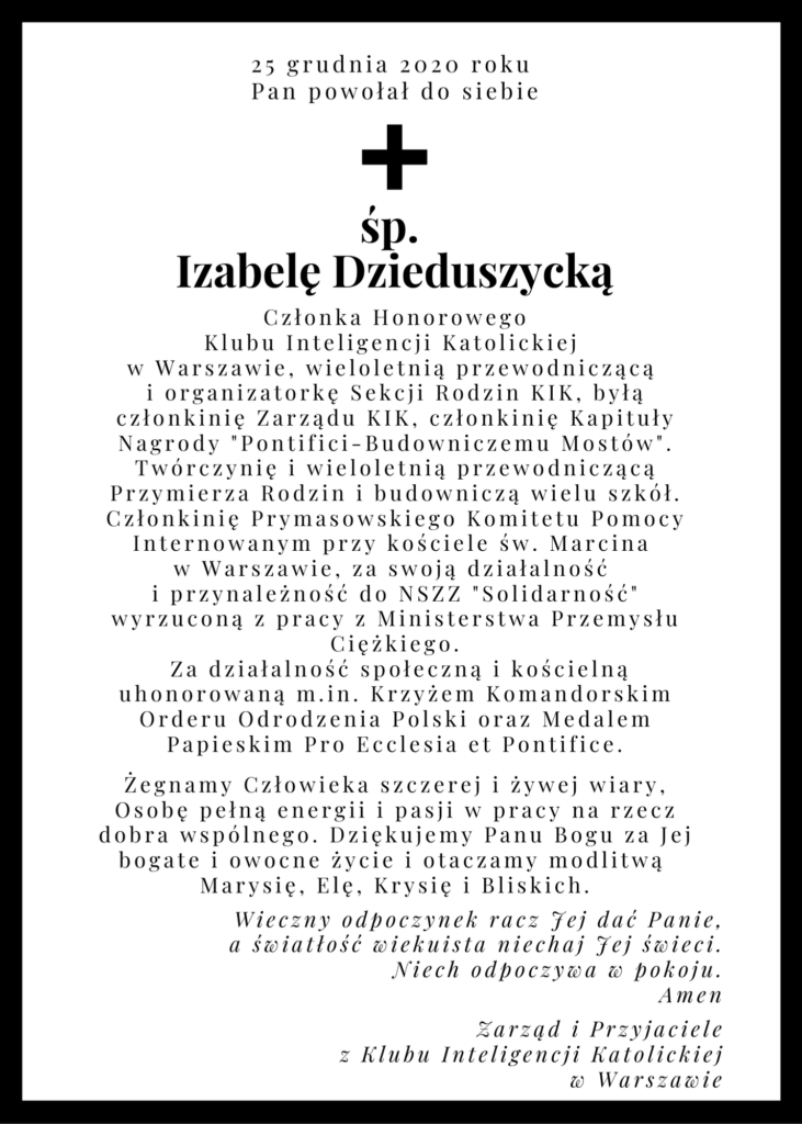 Z ogromnym smutkiem przyjęliśmy wiadomość o śmierci Izabeli Dzieduszyckiej, współzałożycielki Sekcji Rodzin Klubu Inteligencji Katolickiej w Warszawie, założycielki i wieloletniej przewodniczącej Przymierza Rodzin, działaczki katolickiej, Członka Honorowego KIK w Warszawie.