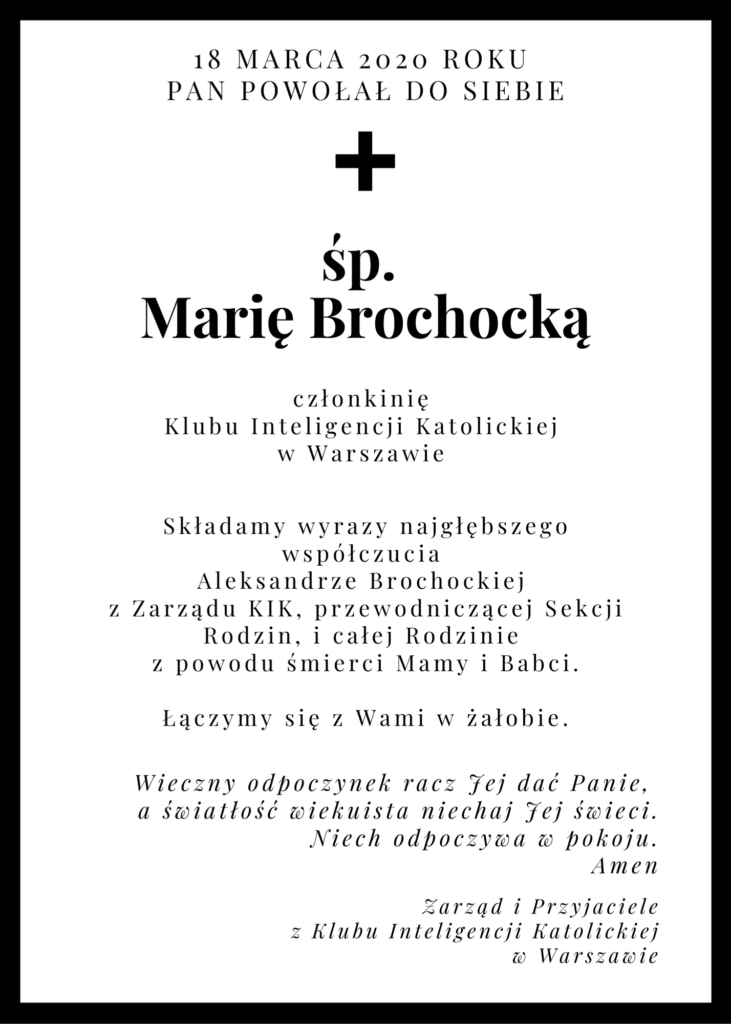 Z głębokim żalem informujemy o śmierci Marii Brochockiej, członkini Klubu Inteligencji Katolickiej w Warszawie.